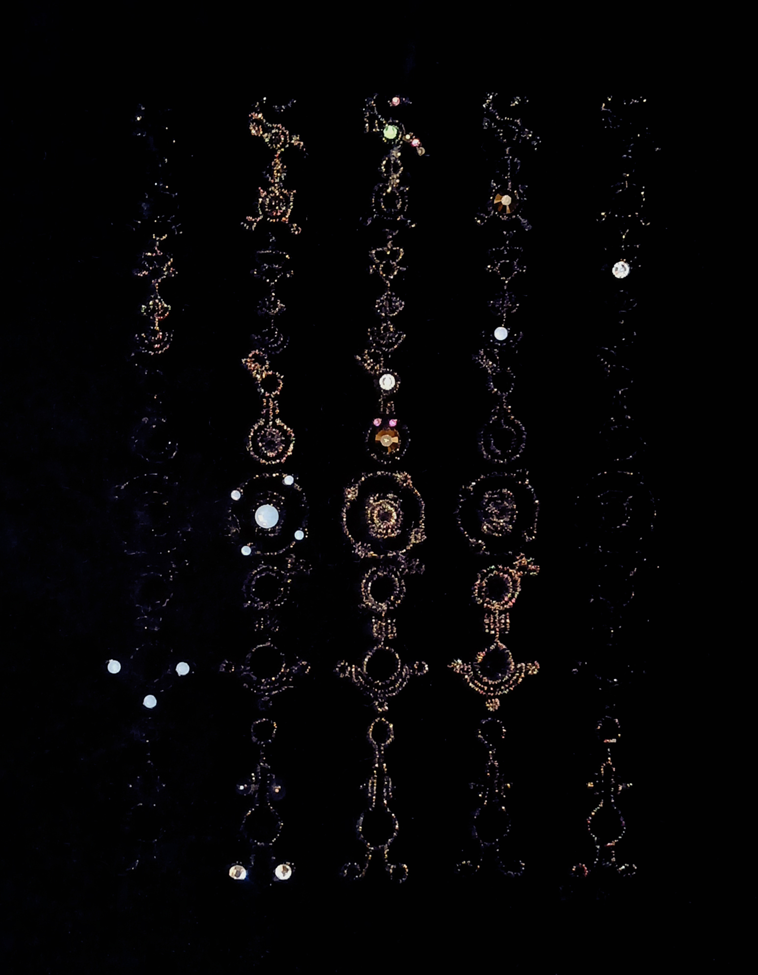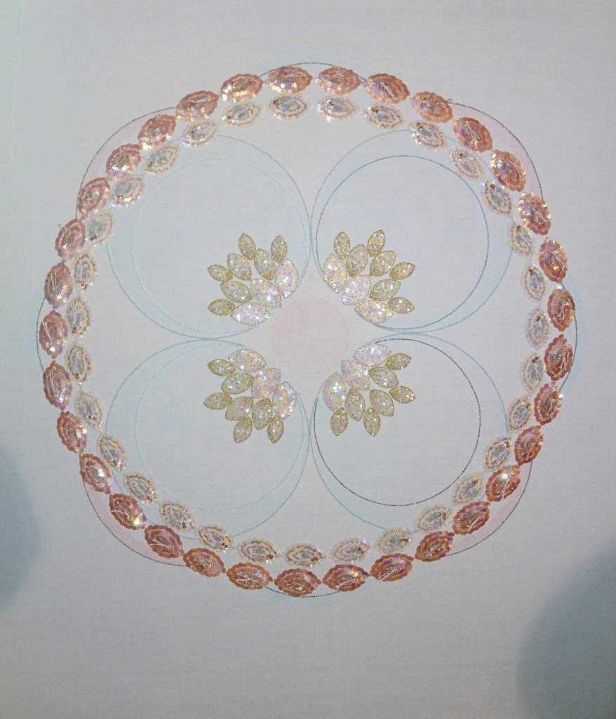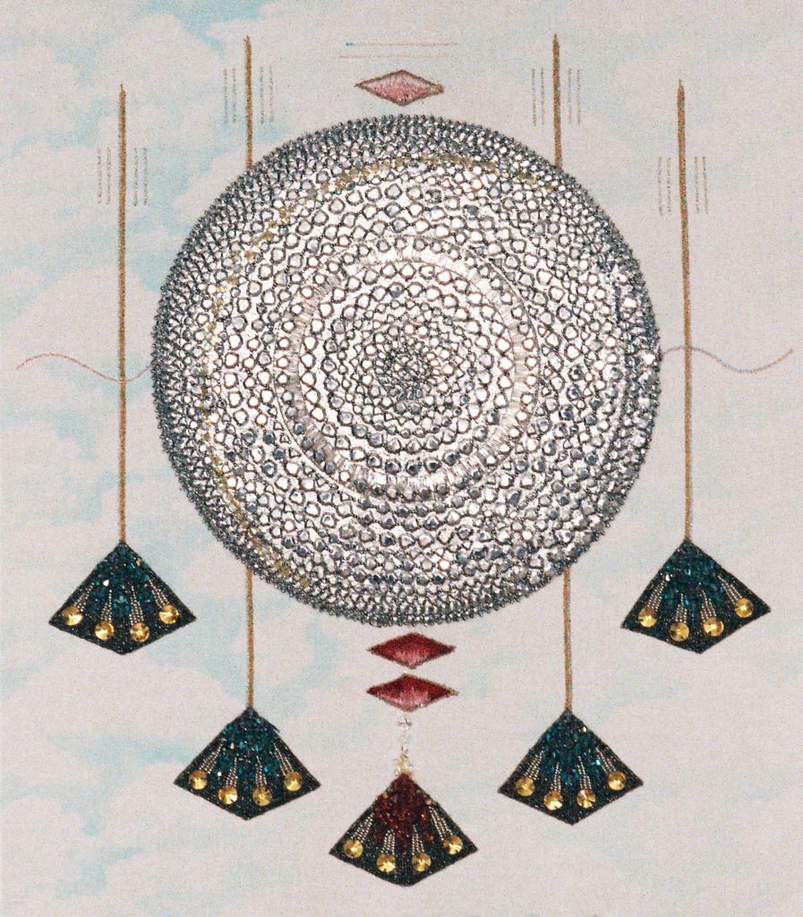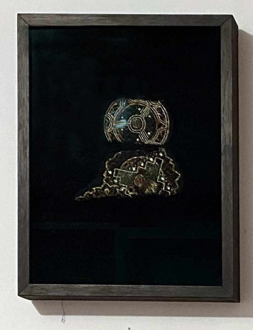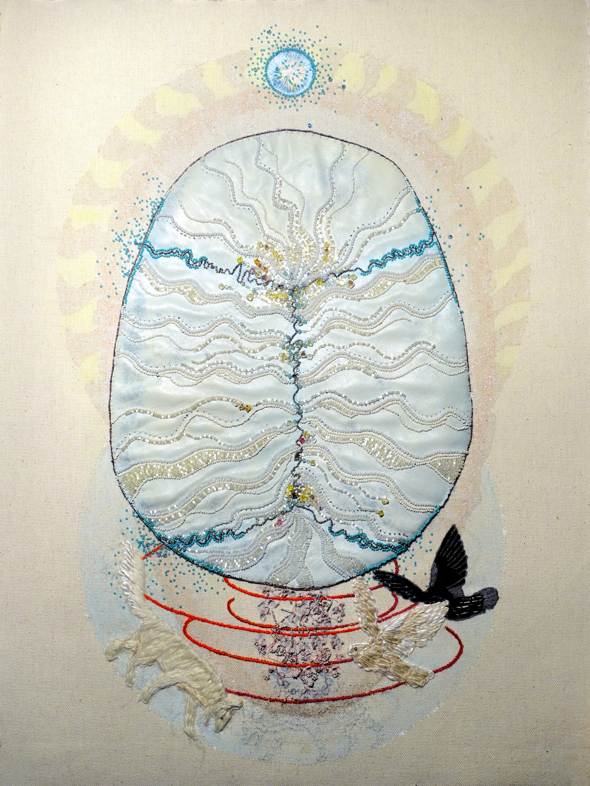 Cranial plates migration, beads and leather embroidery, 2017, 42x56cm