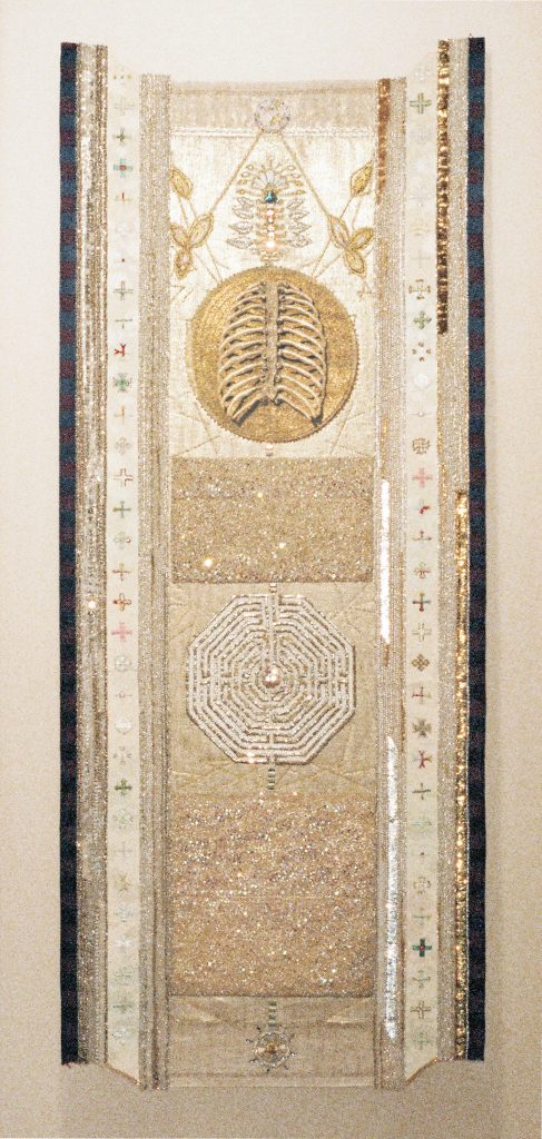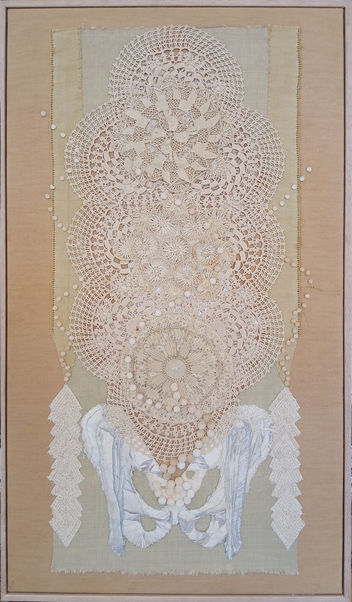 Méditant I, natural dyed linen, lace and monkfruit sugar beads, 2024, 44x80cm
