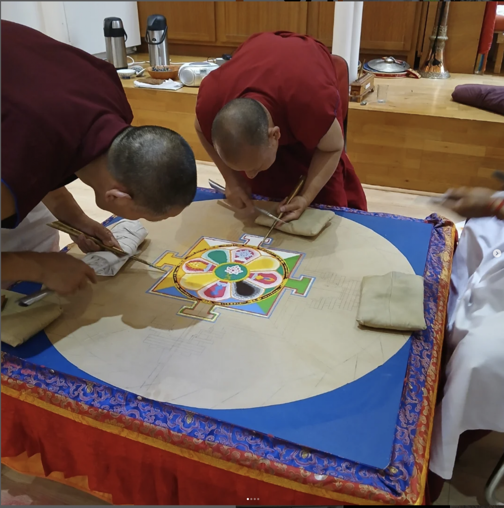 Fabrication sur une semaine, d’un mandala de sable tchenrezi par les moines du monastere de Gyutö, au centre Kalachakra, Paris, en celebration des 90 ans du dalai-lama.