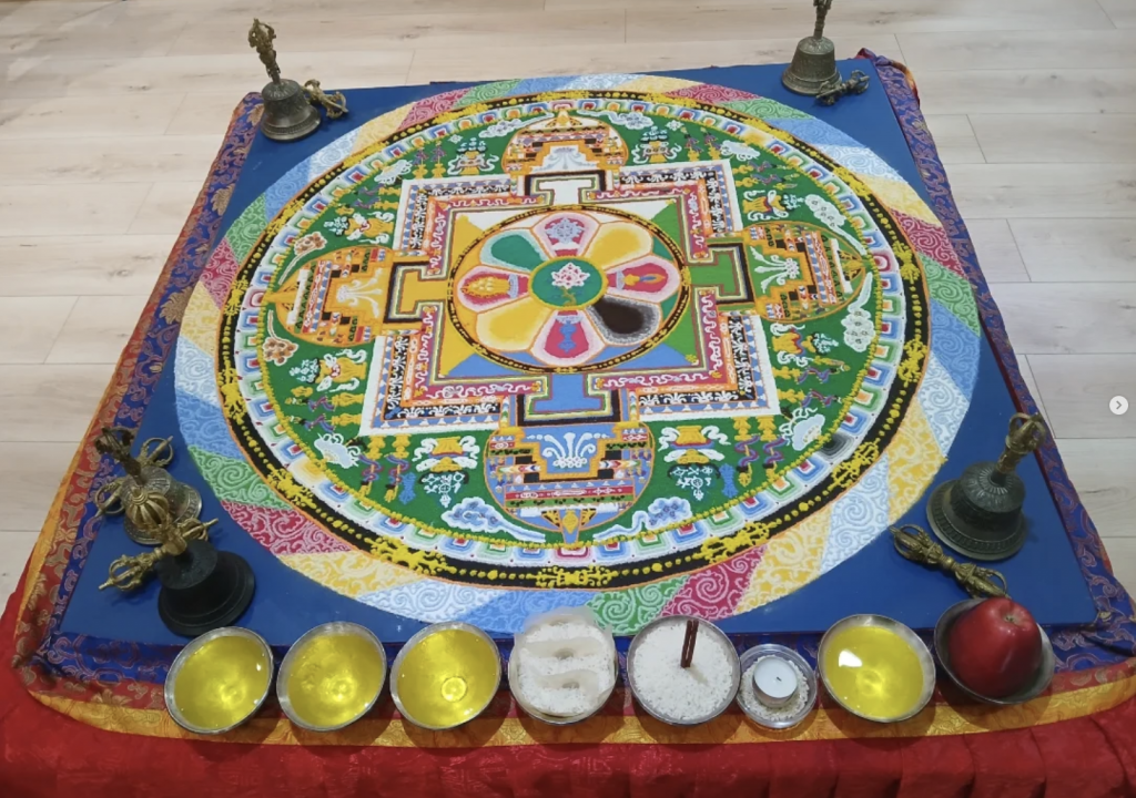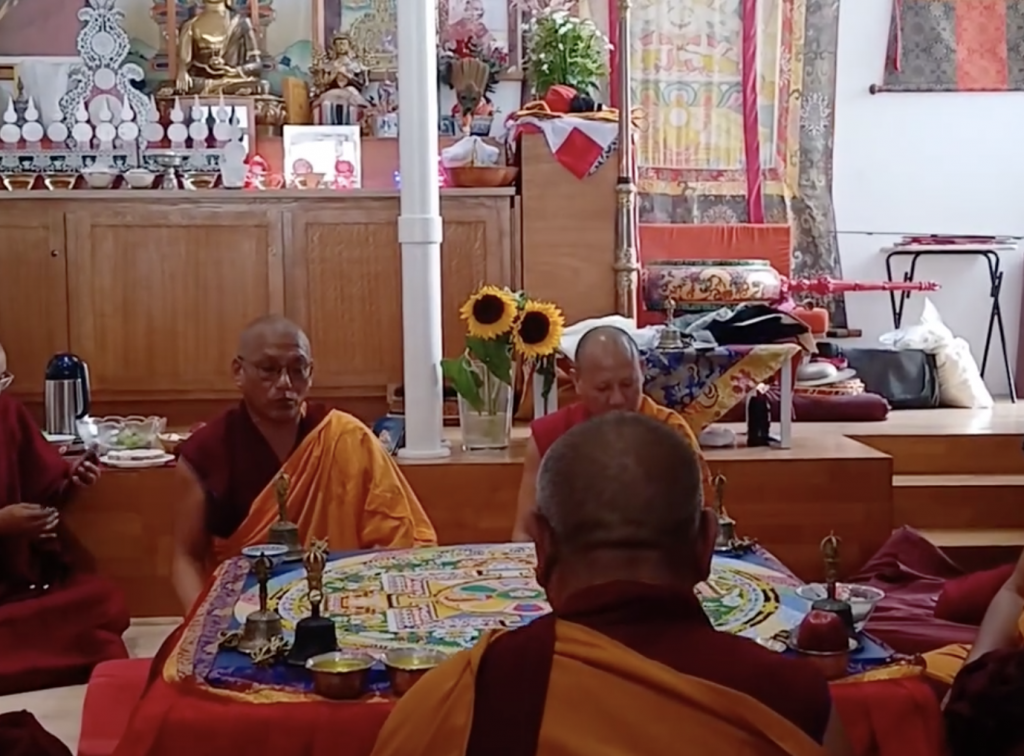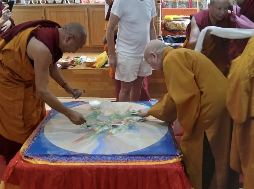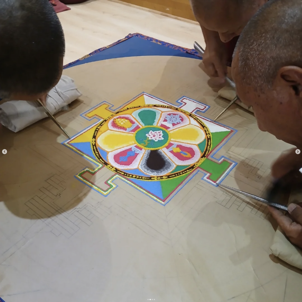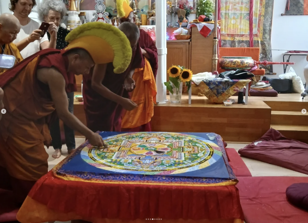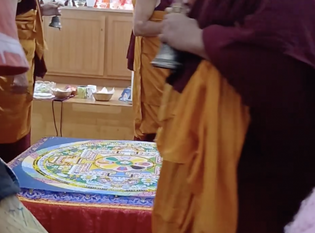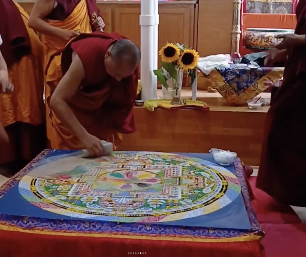 Ceremonie de dissolution du mandala, signifiant l’impermanence de toute chose, avec chants et explication exhaustive de la symbolique du mandala, ainsi que des echanges sur l’etat d’esprit des moines lors de sa fabrication. Puis distribution de sachets de sable, en symbole de delivrance des asservissements mentaux.